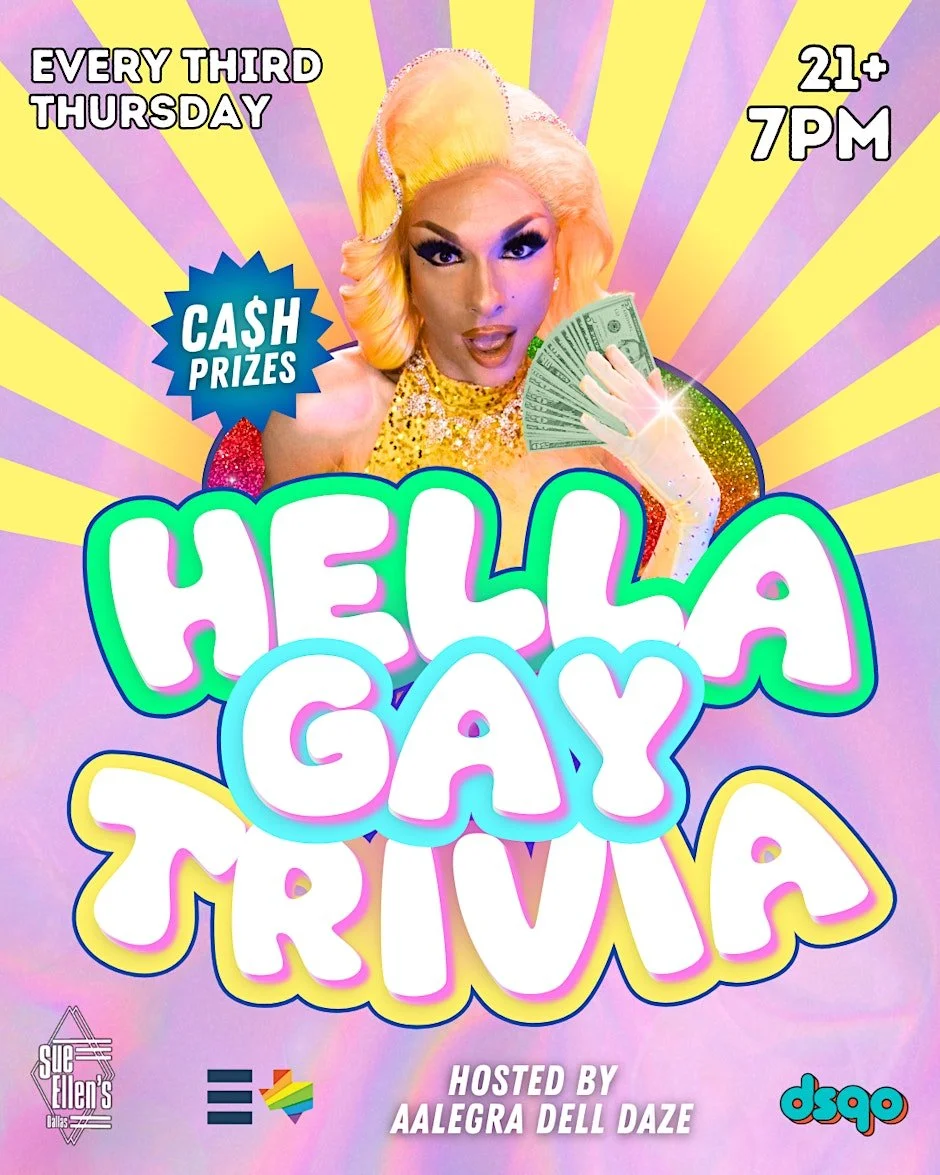 It's time for Hella Gay Trivia!! Join us on the 2nd floor of Sue Ellen's for a night of trivia, prizes, and drinks hosted by Aalegra Dell Daze! We'll also be joined by our community spotlight of the month Package Dallas.