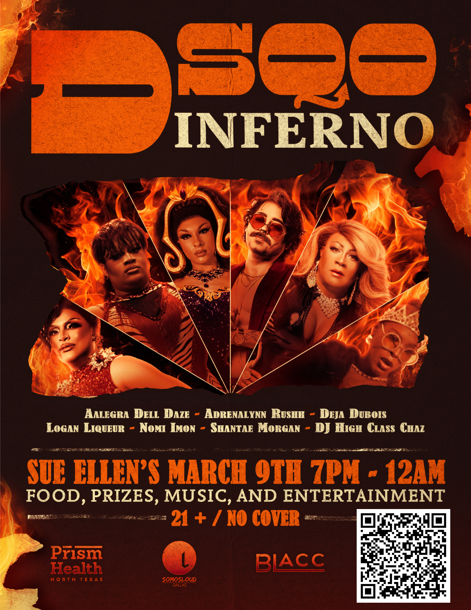 Get fired up for DSQO INFERNO at Sue Ellen’s on March 9th from 7pm-12am!! This is a NO COVER party to celebrate DSQO’s 2-year anniversary and our collective queer resilience as a community. 🔥🪩🔥